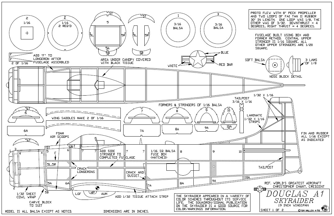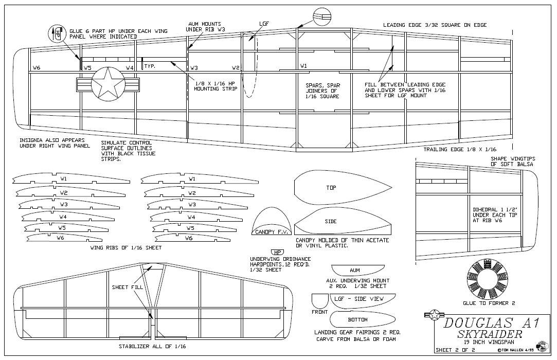 Designed by noted Free Flight sport and scale model airplane designer Tom Nallen, this black and white plan includes full-sized top, side and front views of all components such that they can be built directly over the plan. Stick and sheet balsa stock dimensions are indicated on the plan and all sheet balsa parts are printed full-size for use as templates in cutting out accurate parts to construct the model framework.
