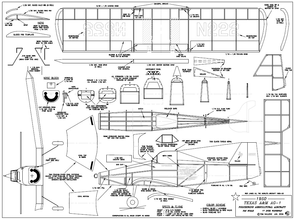 Designed by noted Free Flight sport and scale model airplane designer Tom Nallen, this black and white plan includes full-sized top, side and front views of all components such that they can be built directly over the plan. Stick and sheet balsa stock dimensions are indicated on the plan and all sheet balsa parts are printed full-size for use as templates in cutting out accurate parts to construct the model framework. This is an Intermediate-level model to build and fly and is a good follow-on to a high wing monoplane rubber powered free flight scale model.